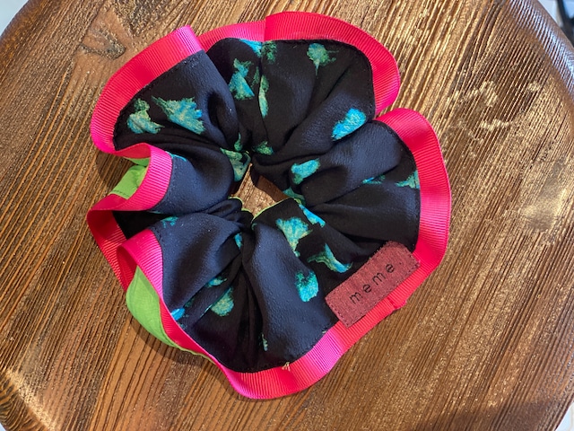こだわりぬいた生地と アクセントのフチリボン 華やかな色使いと丁寧な手仕事によって うまれたシュシュは、あなたの ヘアアレンジを一層素敵に演出します。 髪がさり 腕かざり さまざまな形で日々の生活にイロドリを。 日本製の柔らかいゴムを使用しております。 type: シュシュ color: 表 薄ピンク、黒、白、緑、茶色 裏 蛍光ピンク フチ 黒 サイズ: 直径15cm お届け:こちらの商品はご注文より約1〜3日で発送致します。 ------------------------------------------