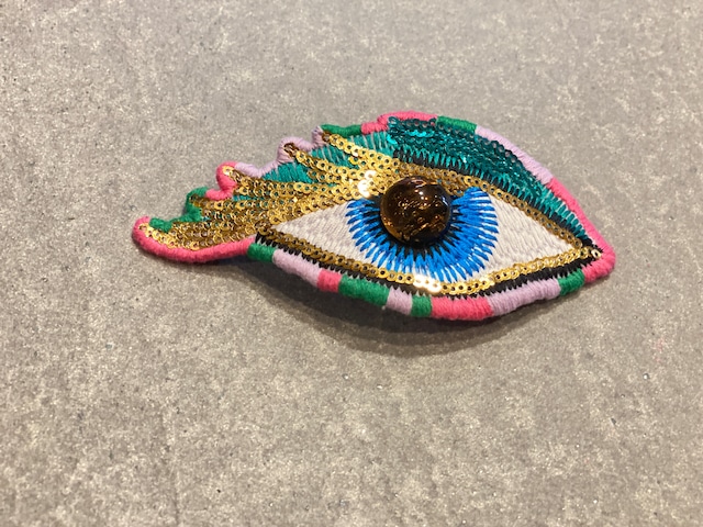 お目めちゃんが可愛いぱっちんぴんです。 後頭部につけて、背後の見守りに ジャケットに添えて華やかに さまざまな形で日々の生活におめめちゃんを。 type: ぱっちんぴん color: 表 青、緑、ゴールド 裏 青 フチ ピンク、緑、紫 サイズ: 横13cm×縦5.5cm お届け:こちらの商品はご注文より約1〜3日で発送致します。 ------------------------------------------