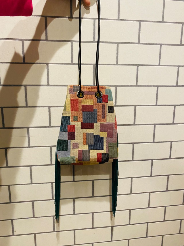 2wayでつかえるミニバッグ 動くたびに揺れるフリンジがキュート! 肩掛けにする時に ぎゅっと口がしまると フリンジがよく見えて可愛いです。 スマホ、お財布、リップを入れても まだ少し入ります。 フォーマルにも カジュアルにも コーデのポイントにばっちりです。 持ち手は黒の革紐になっています。 type: bag color: 表面 白地にカラフル 裏地 黄色 フリンジ 深緑 サイズ: 縦19cm 横15cm マチ9cm お届け:こちらの商品はご注文より約1〜3日で発送致します。 ------------------------------------------