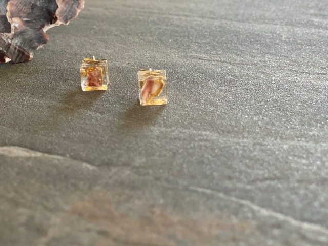 oyster shell series 広島県呉市で生産された牡蠣の殻をアクセサリーに仕立てたサスティナブル商品。 牡蠣殻は何日もかけて消毒後、滅菌器で滅菌したのちにコーティングしております。 瀬戸内海で育った牡蠣の魅力を、耳元でお楽しみください。 牡蠣殻提供 (有)中野水産 ※ モデル画像は、同じシリーズを着用したイメージ画像です。 金具: ピアス 素材: surgical stainless サージカルステンレスは、ステンレスの中でもアレルギー性の極めて低い素材です。医療用工具のメスやハサミ、ボディピアスにも使用されています。 サイズ: 0.7cm角キューブ お届け:こちらの商品はご注文より約1〜3日で発送致します。 ------------------------------------------