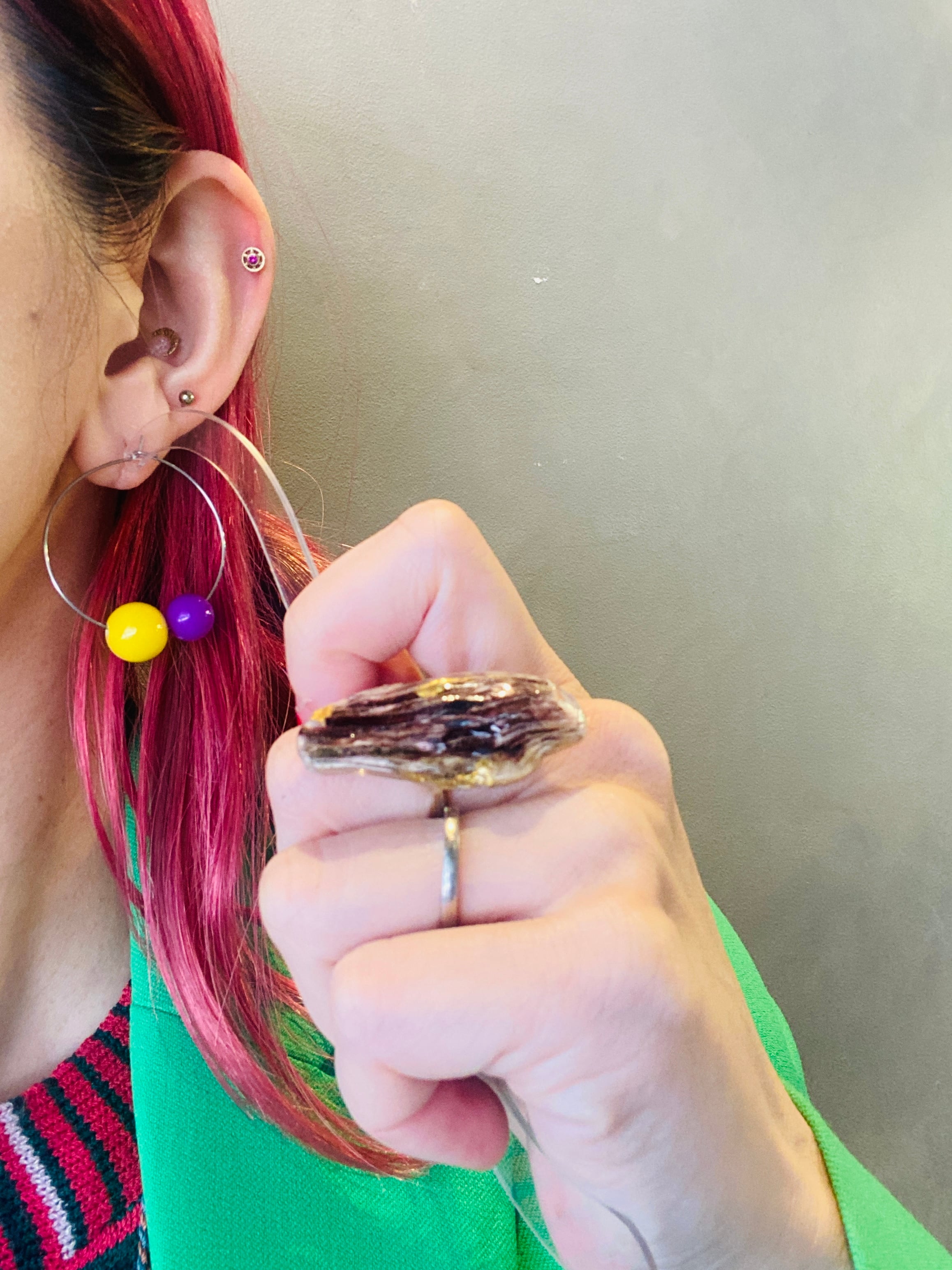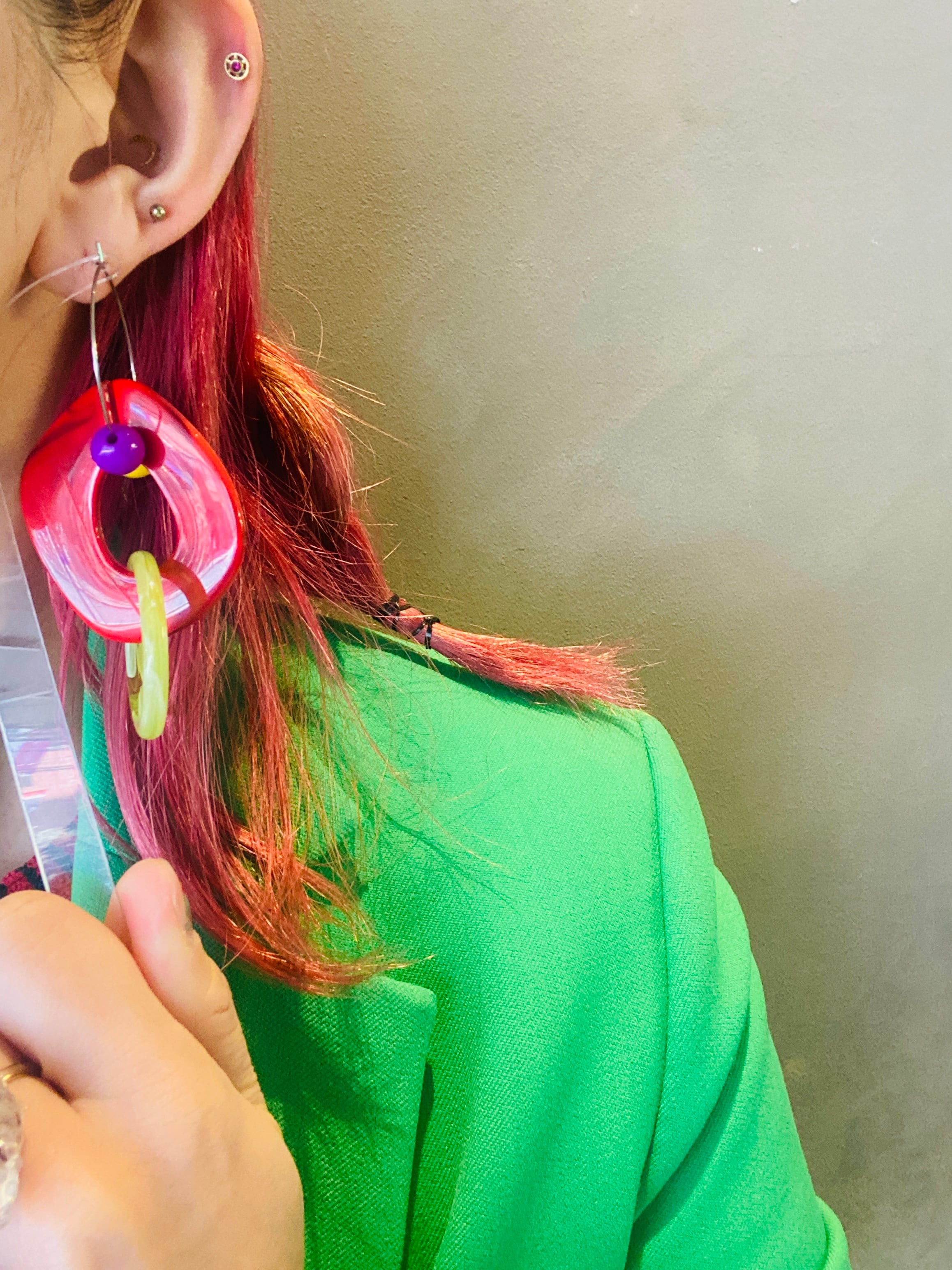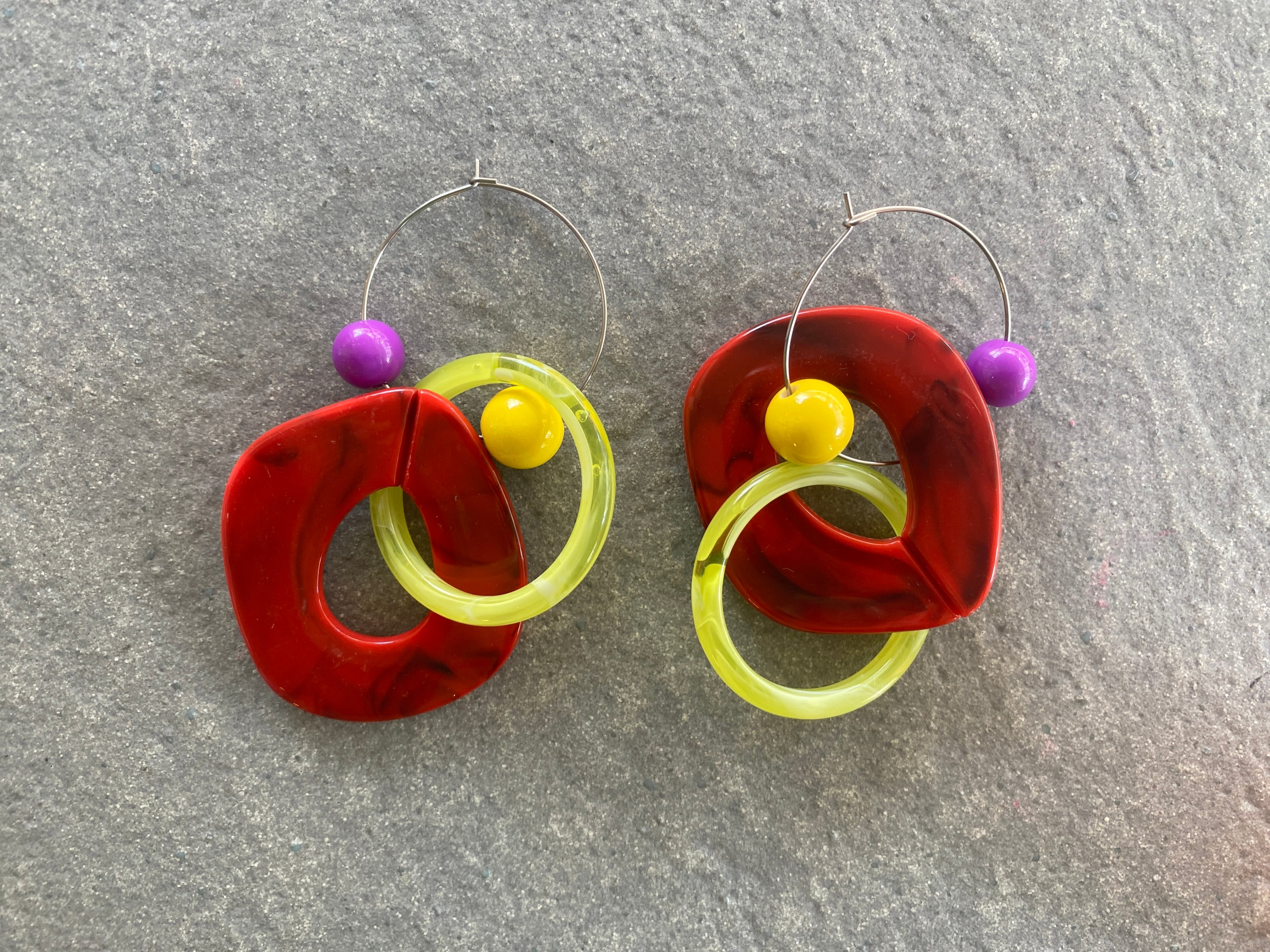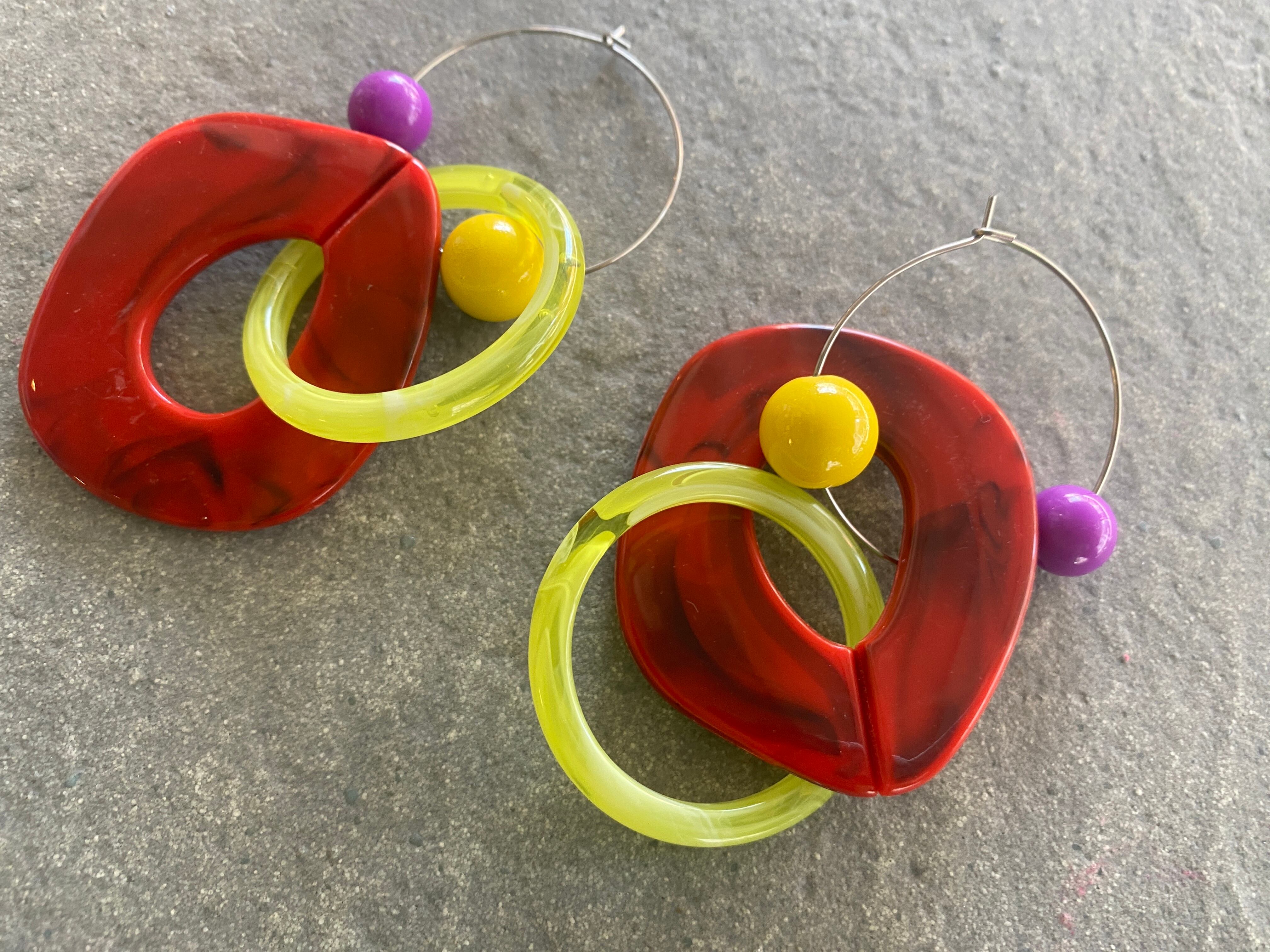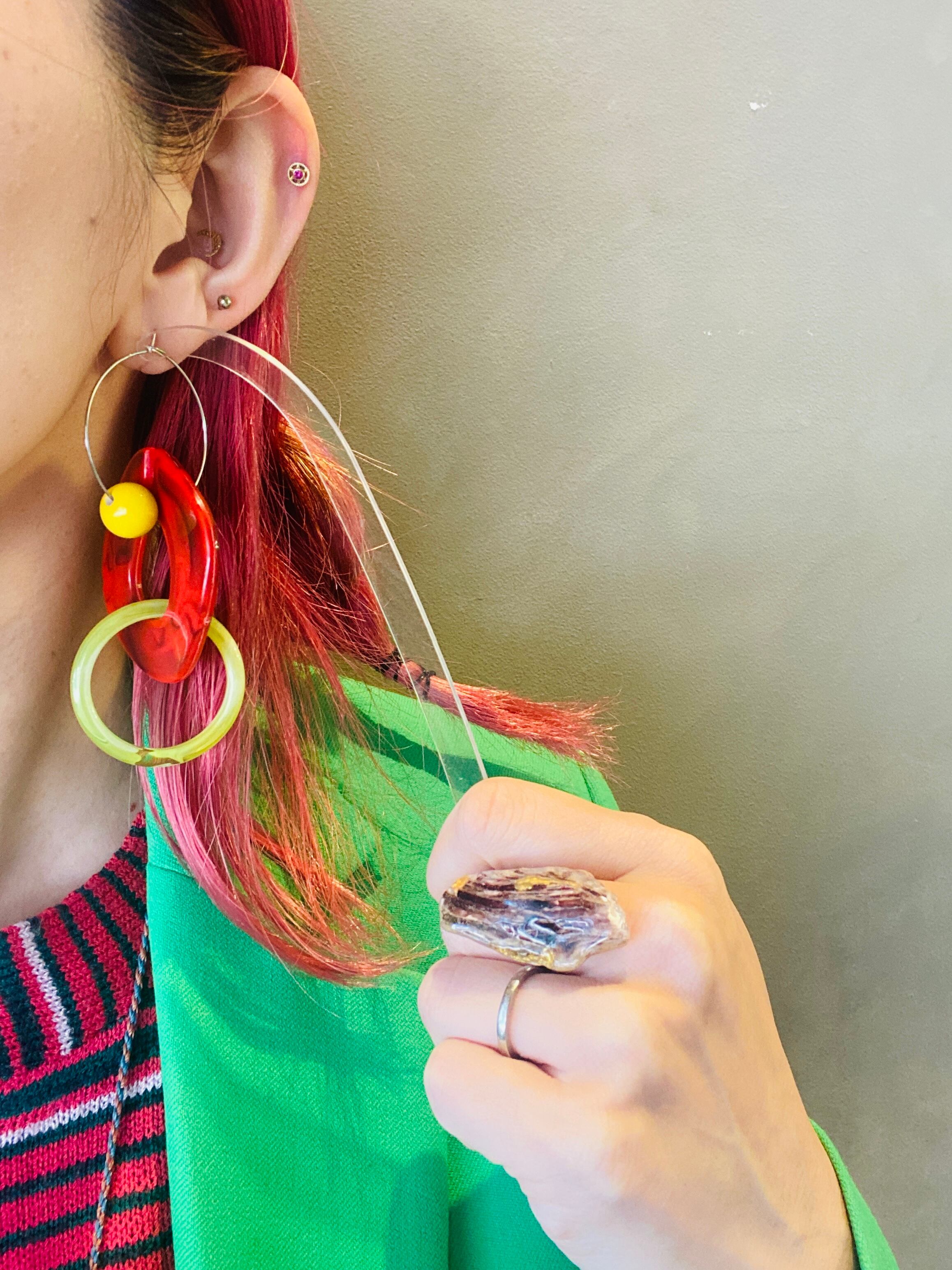 リングパーツを上下逆にしてシンメトリーにしてもok.リングパーツを片方だけつけてアシンメトリーにしてもok.リングパーツを取って、フープピアスとしても使用可能!使い方無限大のカラフルピアスです♡